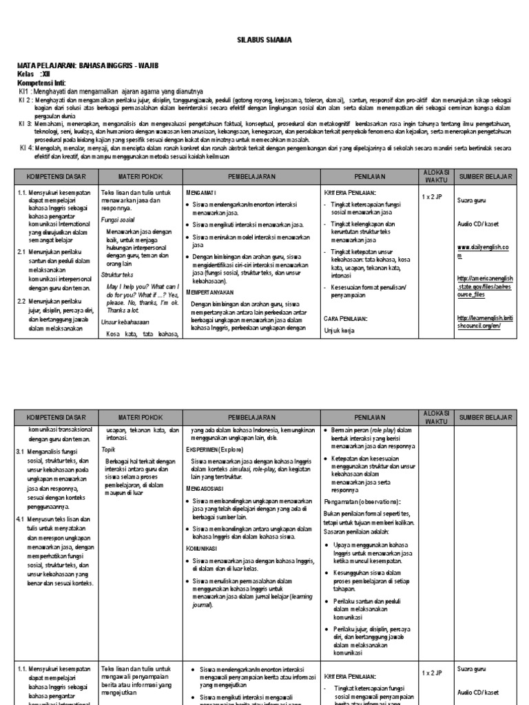 Silabus Bhs Inggris Kelas Xii Kurikulum 2013 Pdf