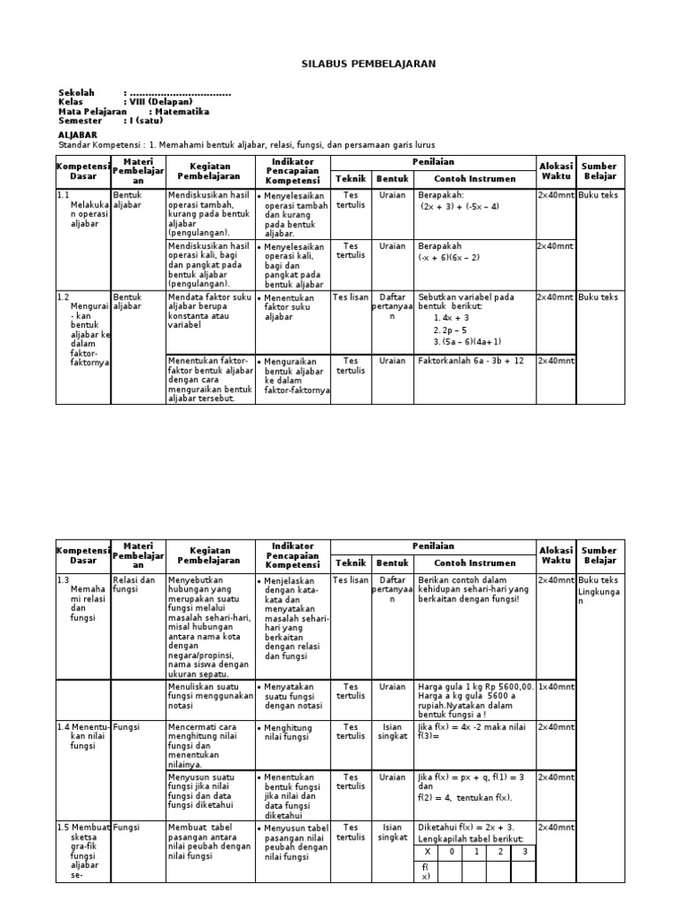 Silabus Matematika Smp Berkarakter Kelas Viii Semester 1 Pdf